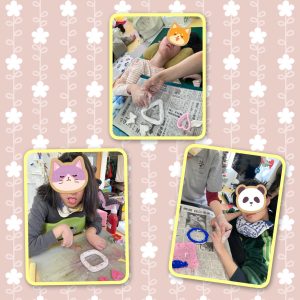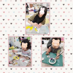 紙粘土をこねて型取りをしたり、ハートや丸、三角など思い思いの形のフレームを作りました。